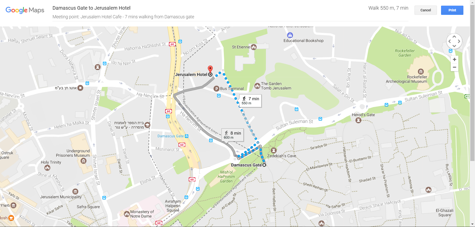 If coming from Bethlehem, the bus station is between the Damascus Gate and the meeting point, an easy 5 minute walk from the hotel straight along Nablus Road.