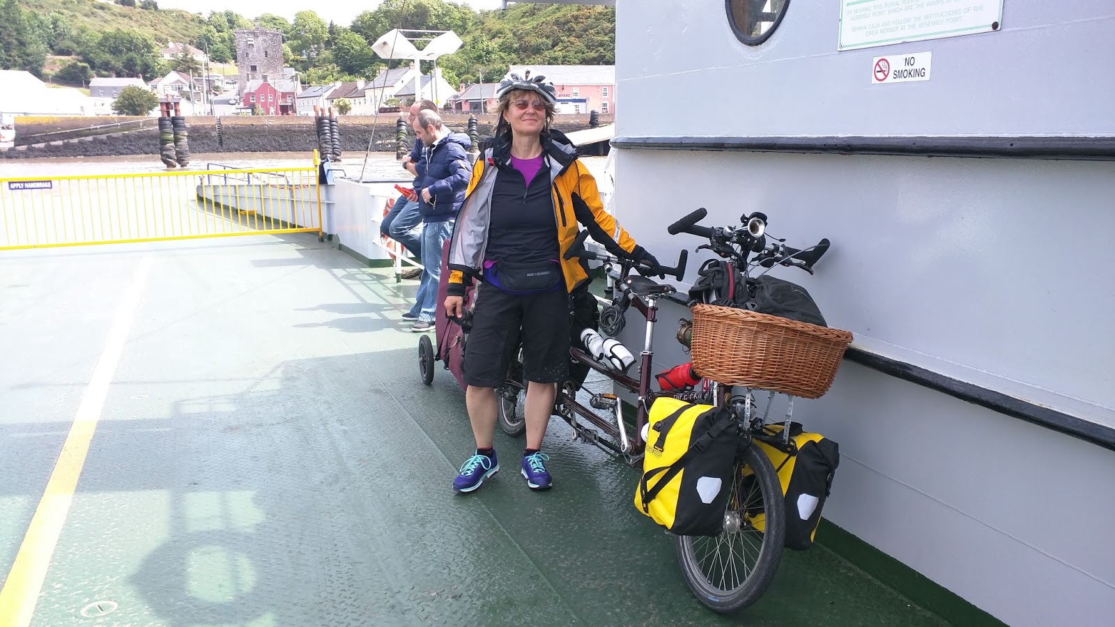 I return outside and then a railway man in uniform pokes his head out the door and we assure him that the tandem is really quite small and the harp trailer detaches. Then before further questions can be asked, we scuttle off into town to have lunch by the river.
